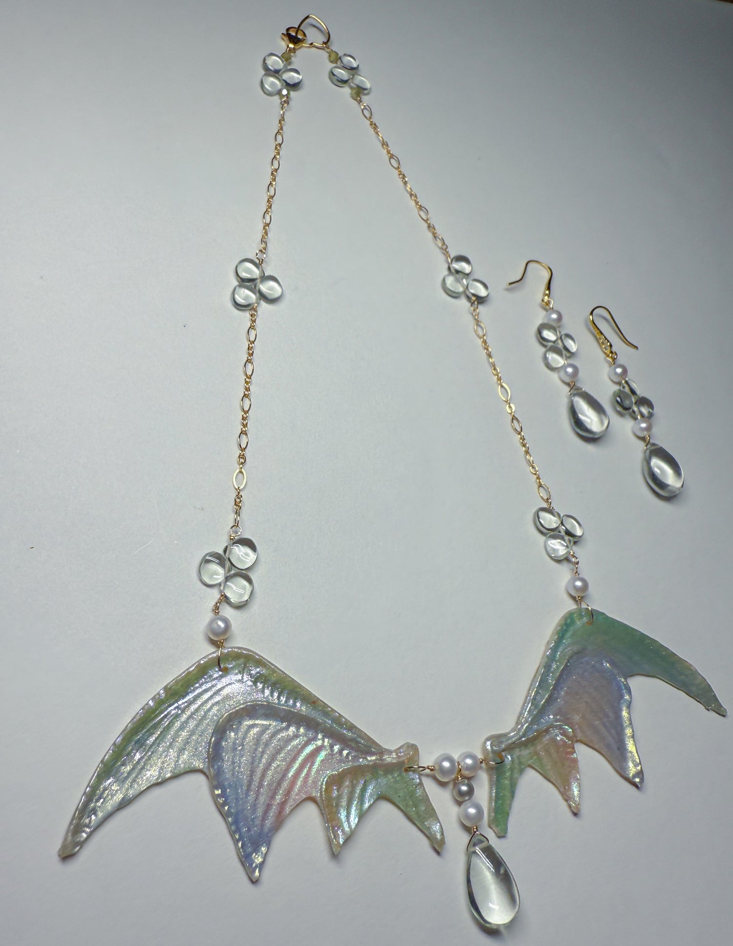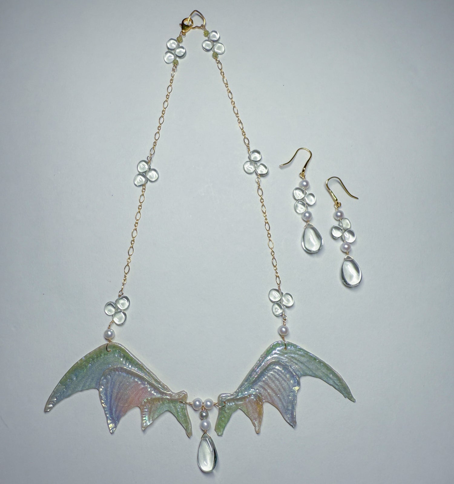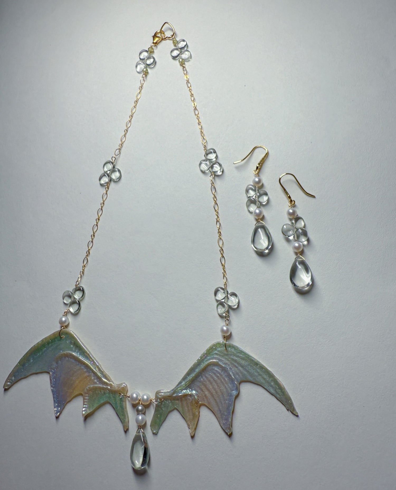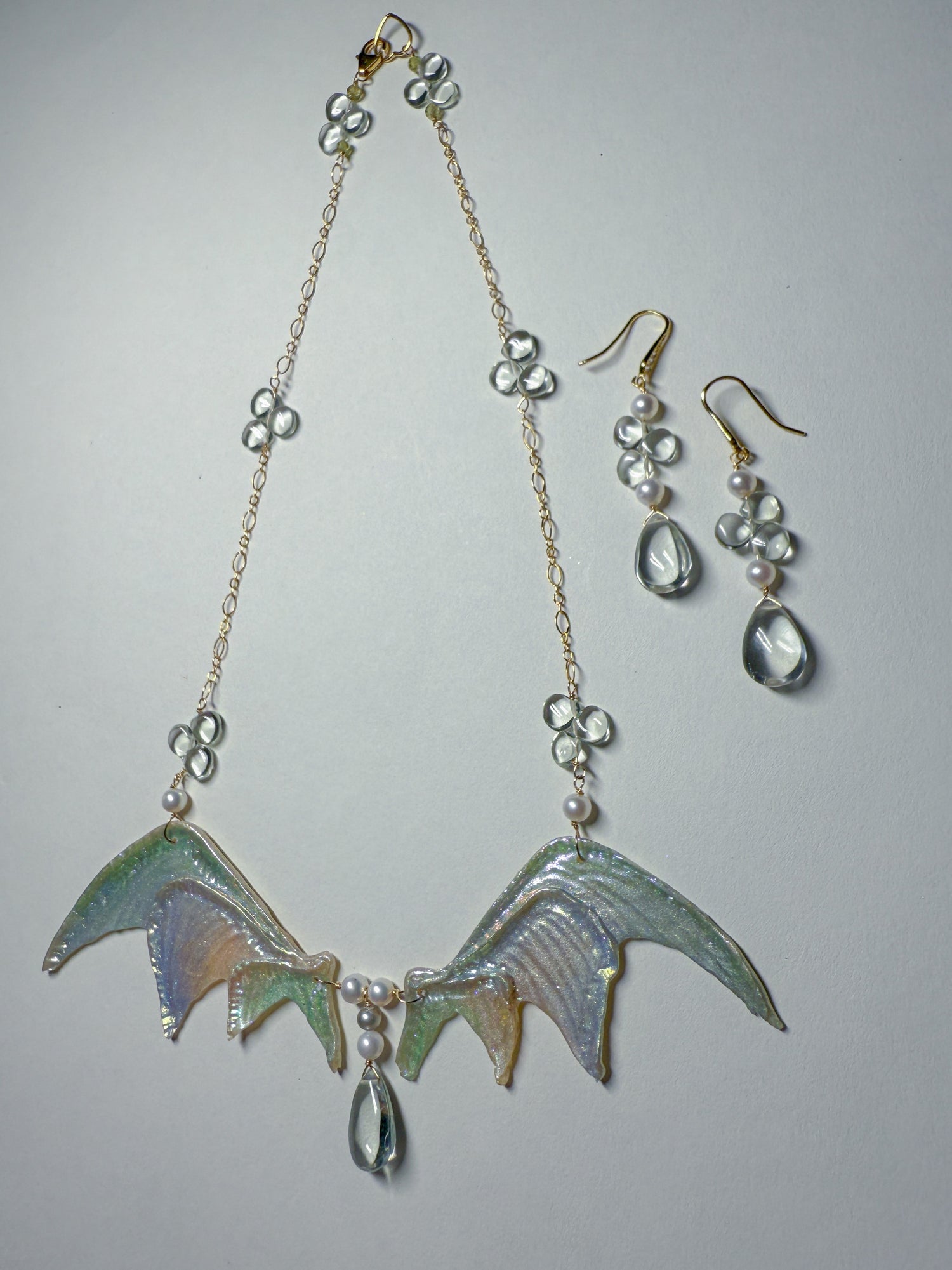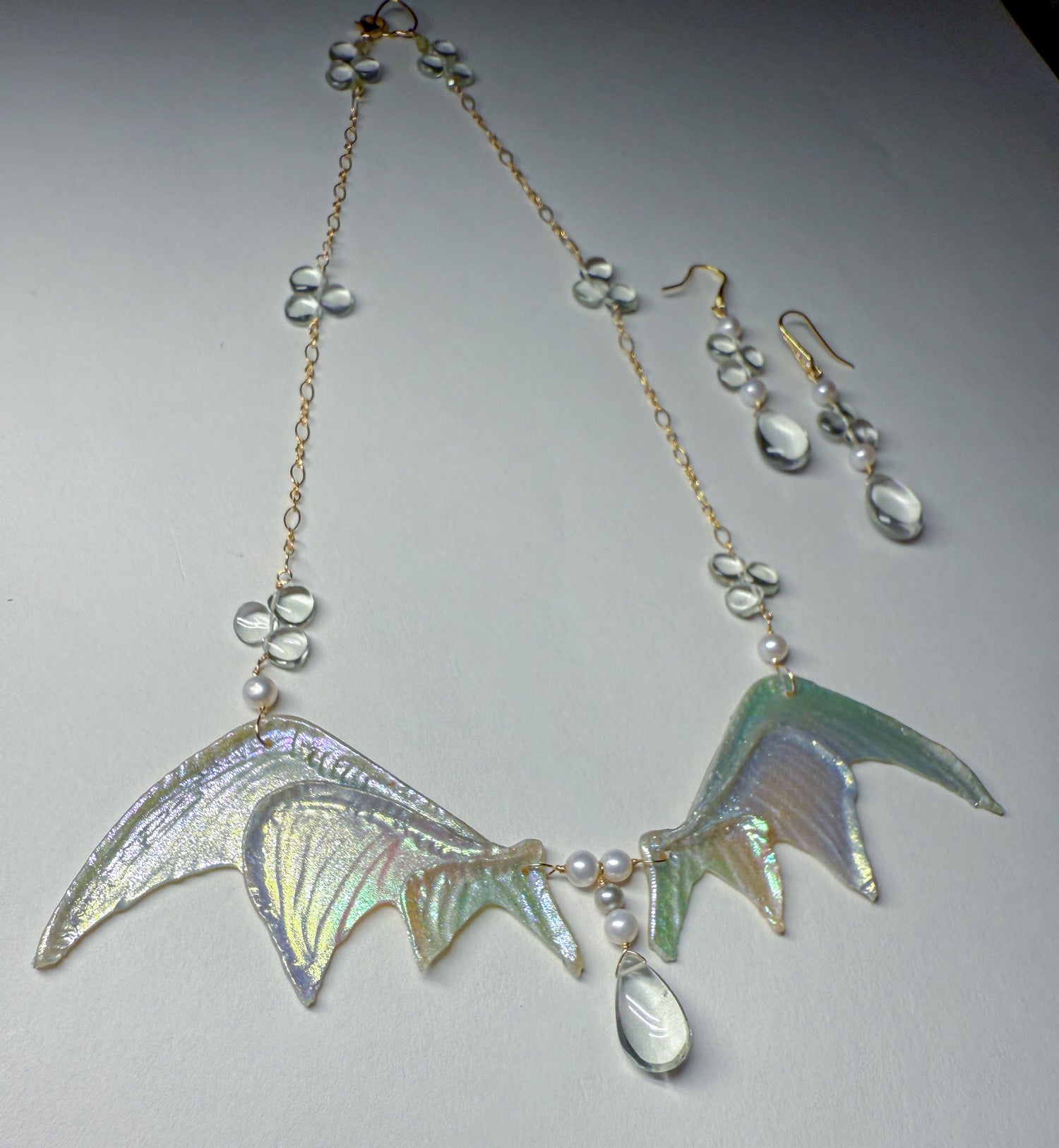 Shimmering silvery rainbow wings with whimsical pale green amethyst dewdrops scattered on the 14k gold Filled chain and in the center. Coordinating everyday earrings