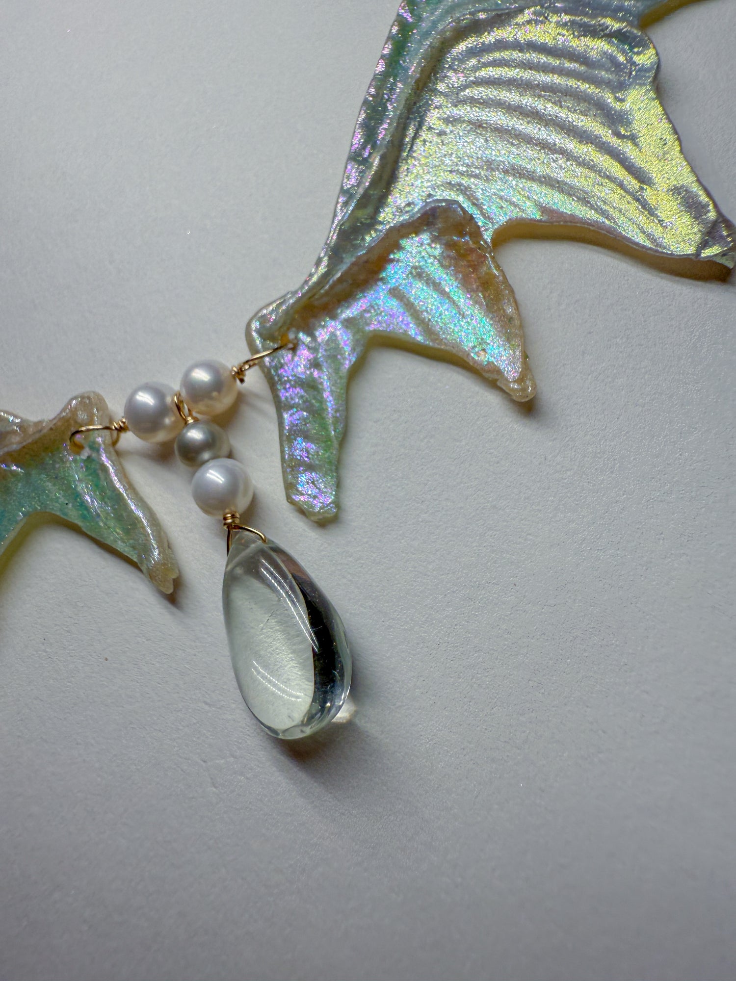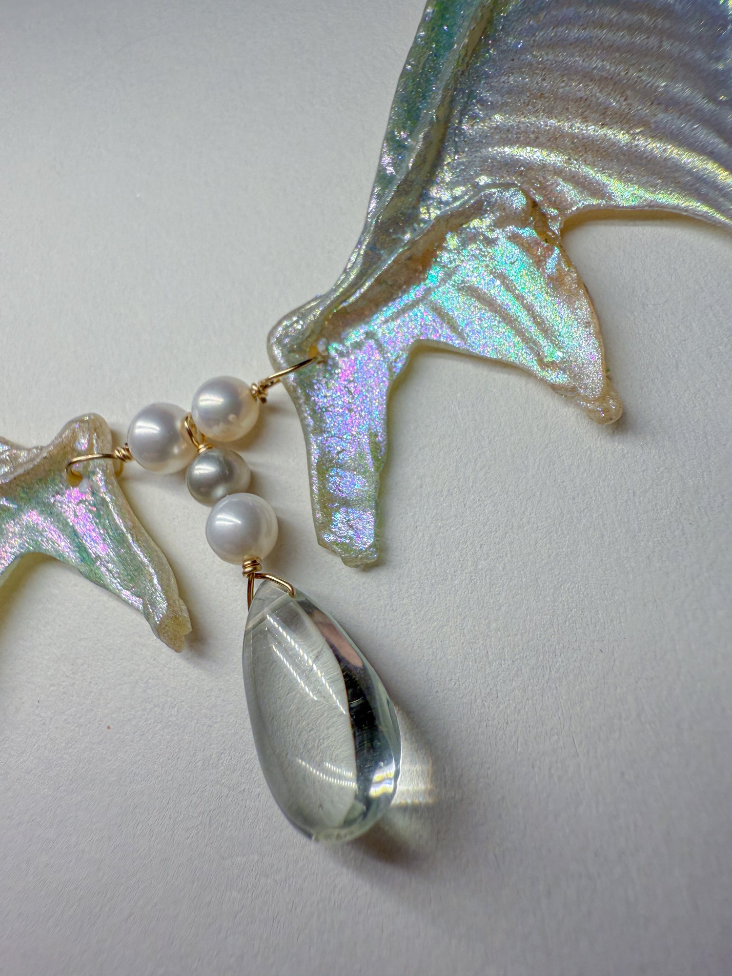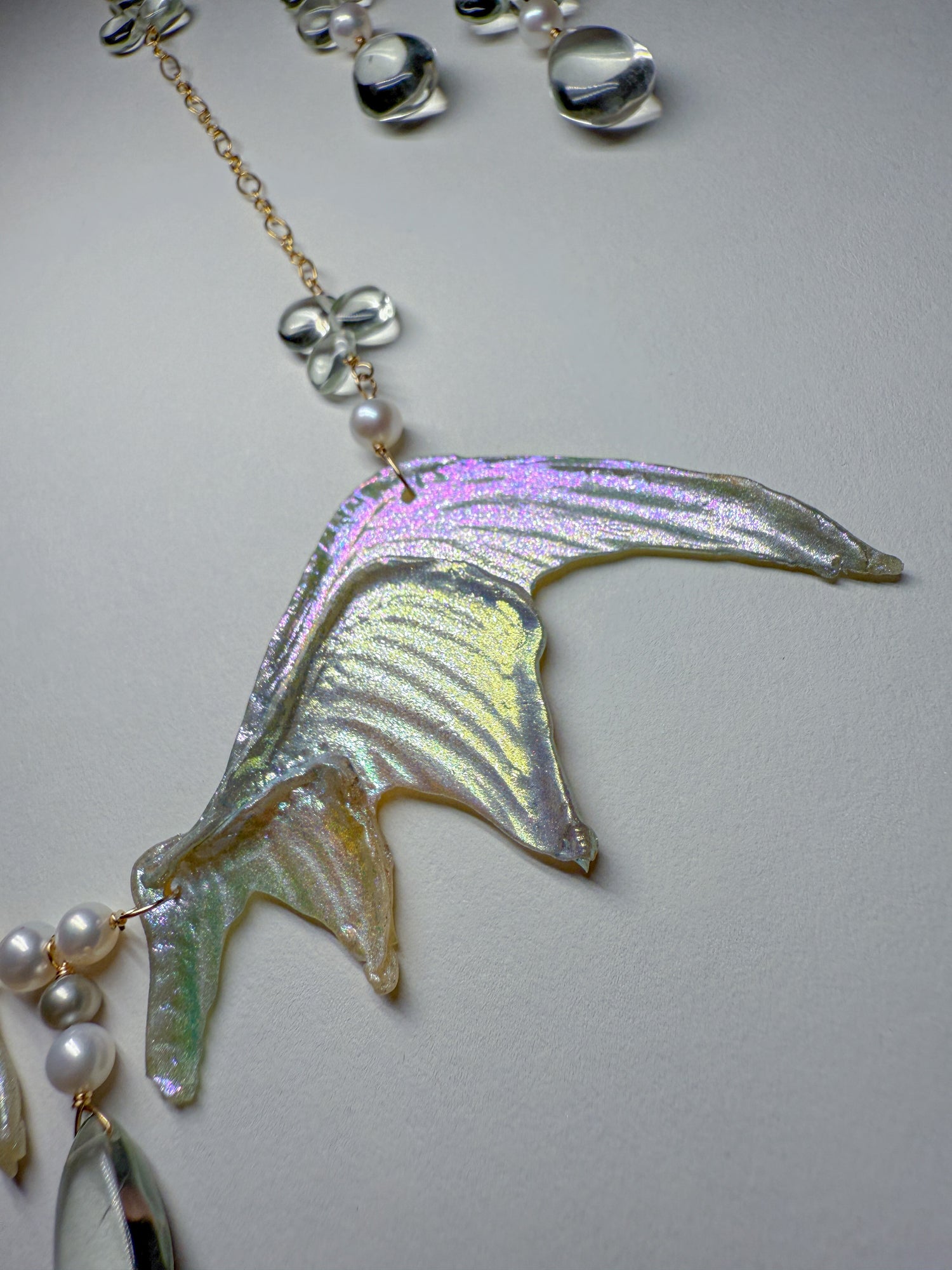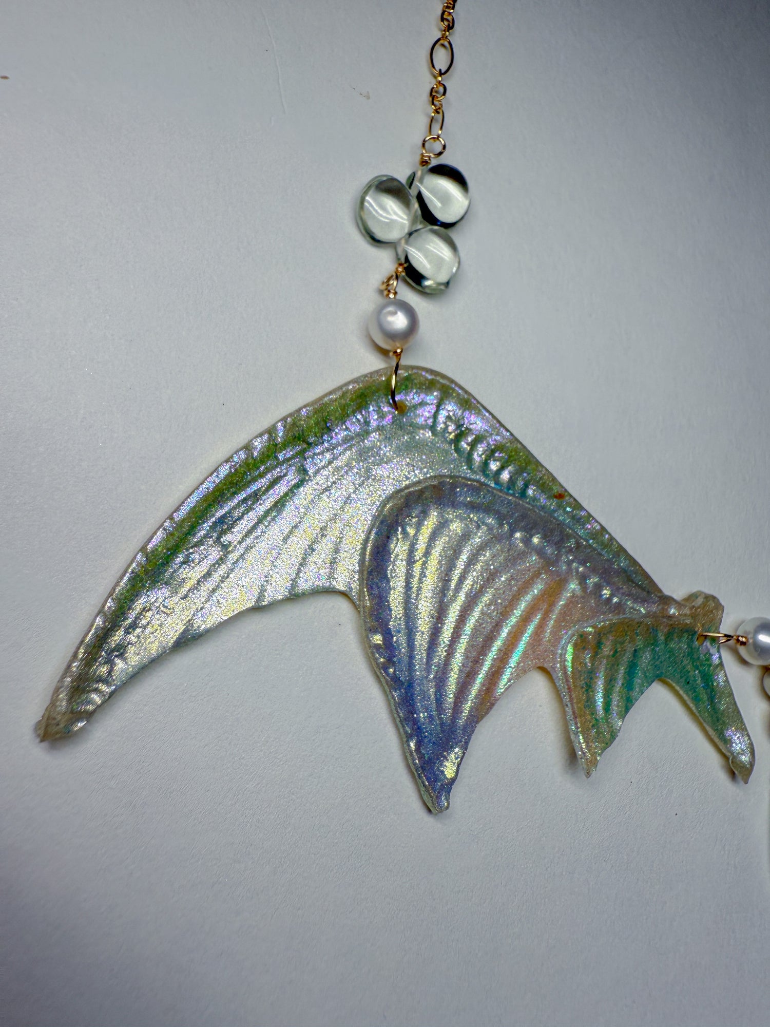 Shimmering silvery rainbow wings with whimsical pale green amethyst dewdrops scattered on the 14k gold Filled chain and in the center. Coordinating everyday earrings