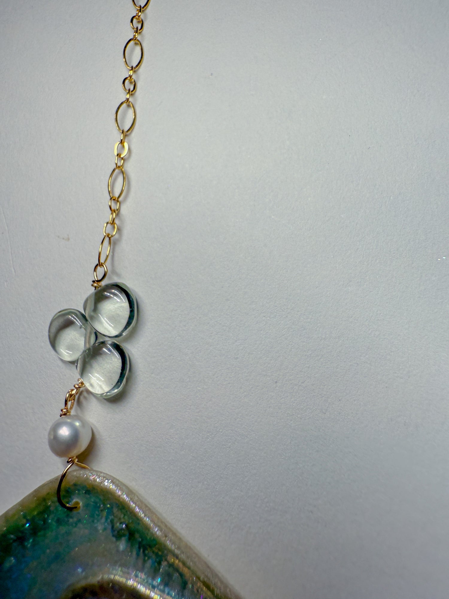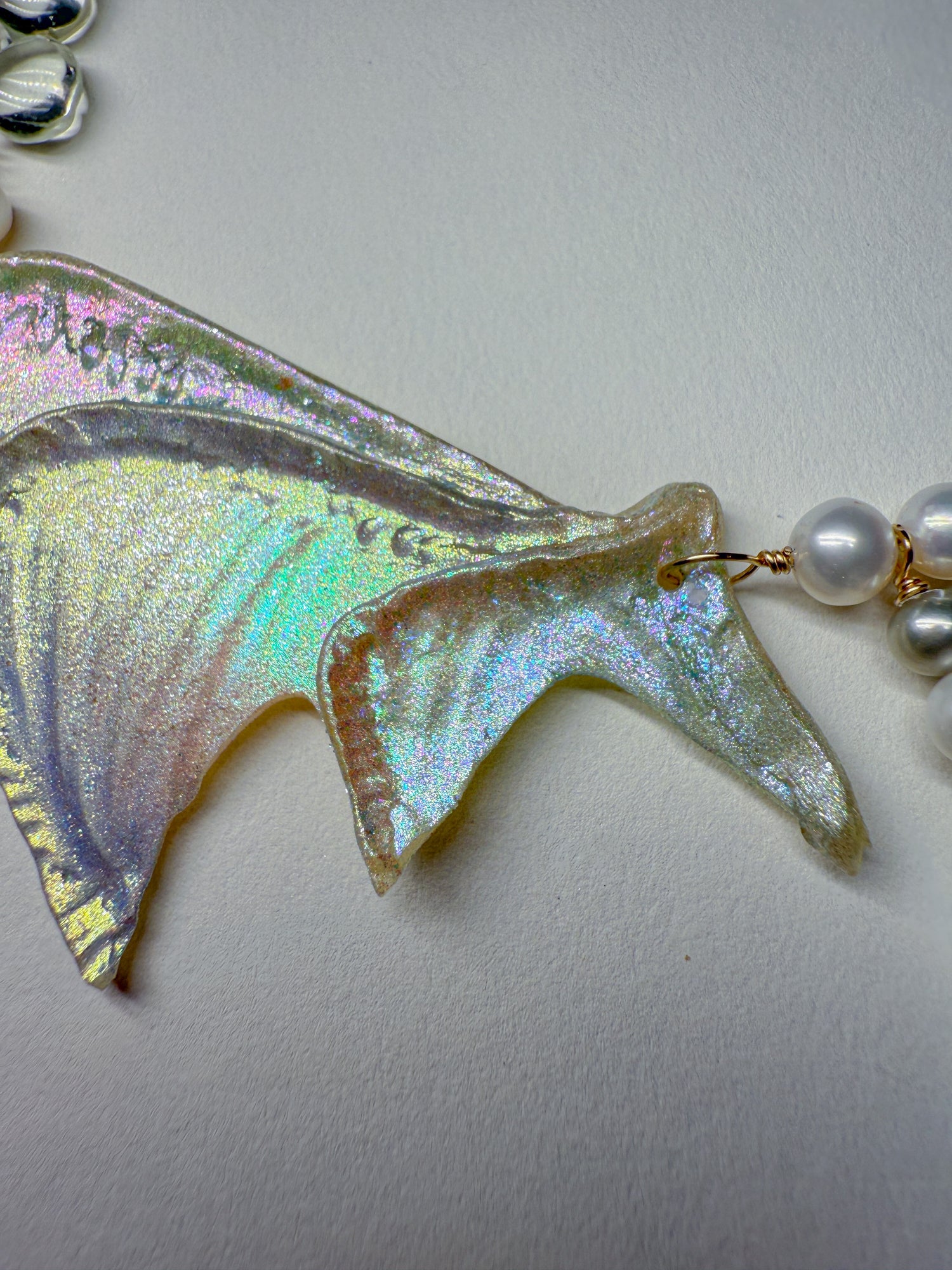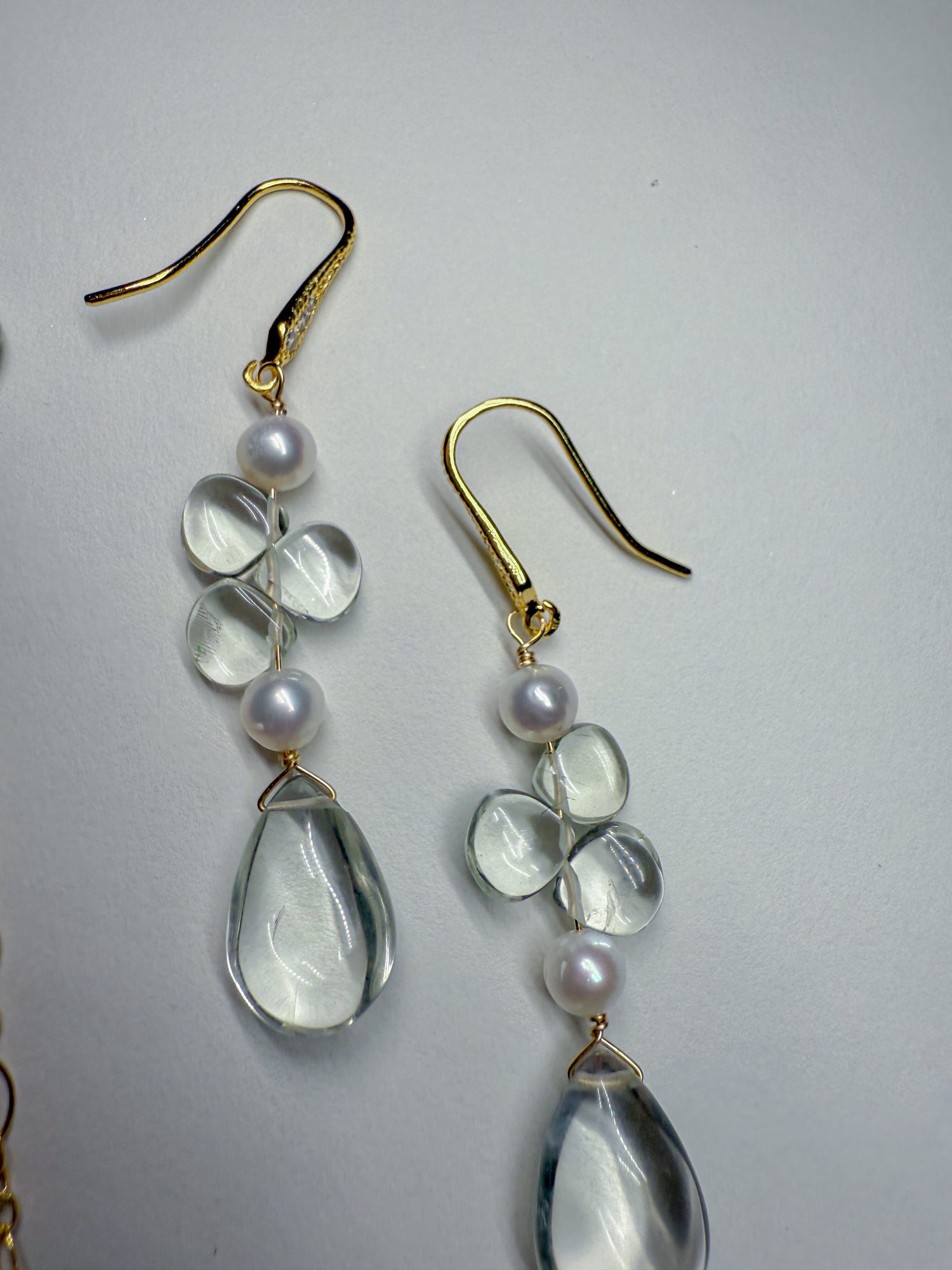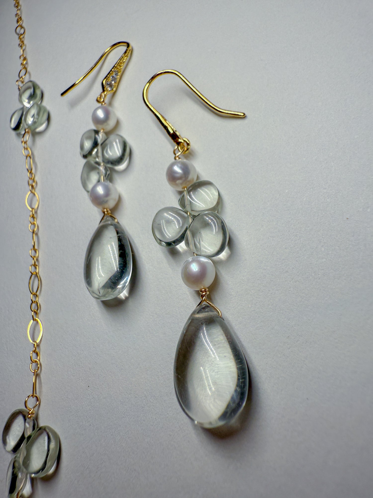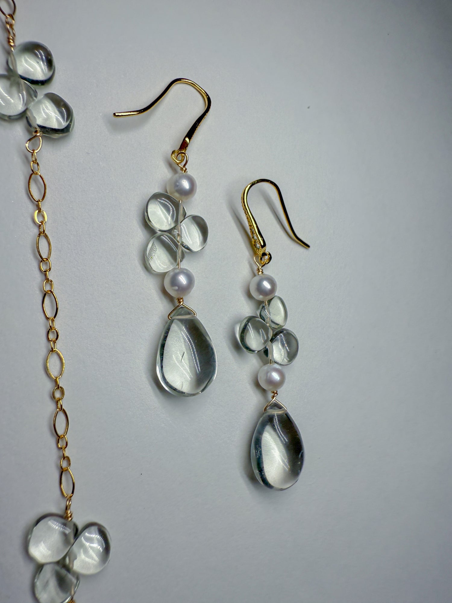 Shimmering silvery rainbow wings with whimsical pale green amethyst dewdrops scattered on the 14k gold Filled chain and in the center. Coordinating everyday earrings