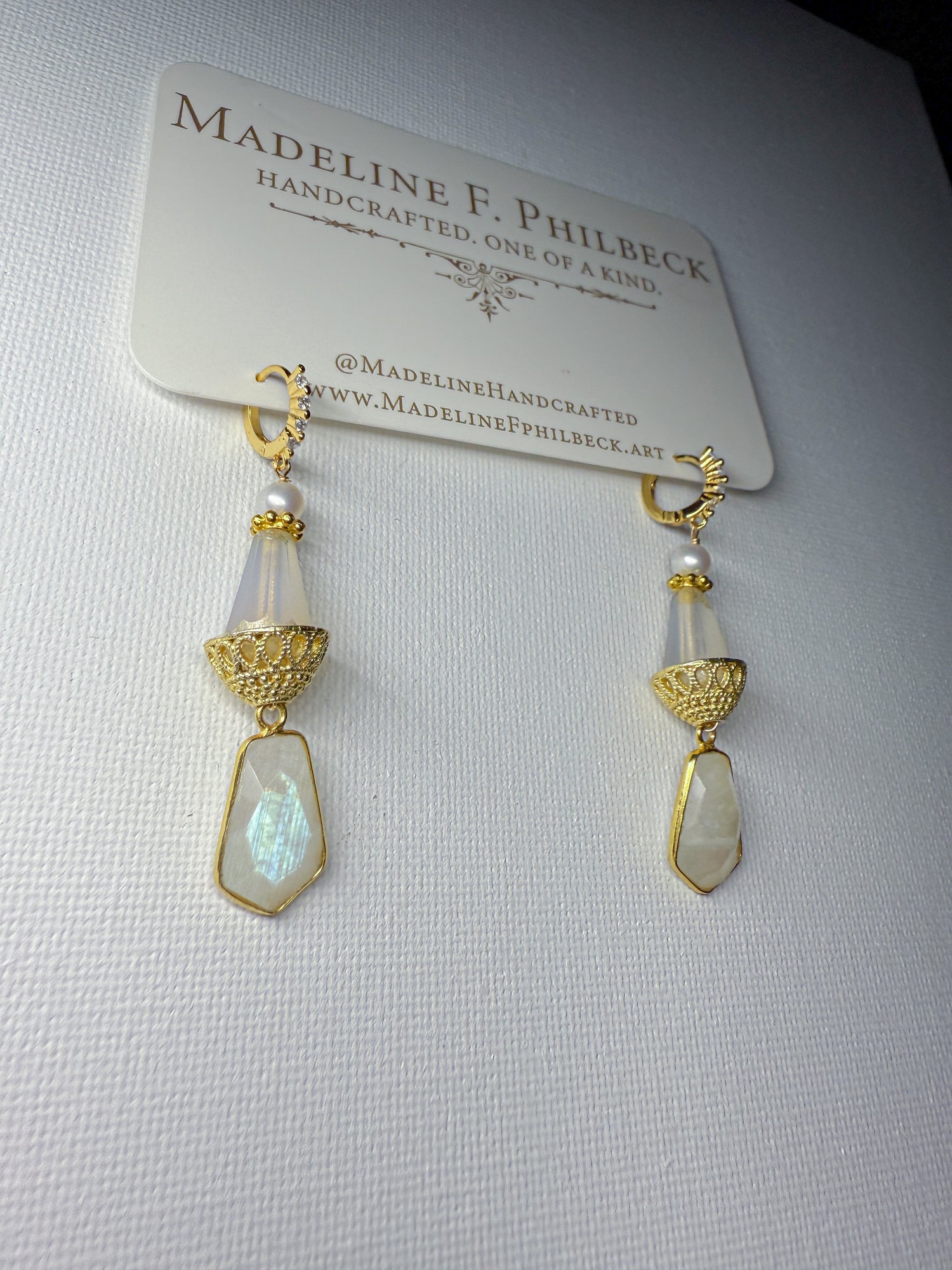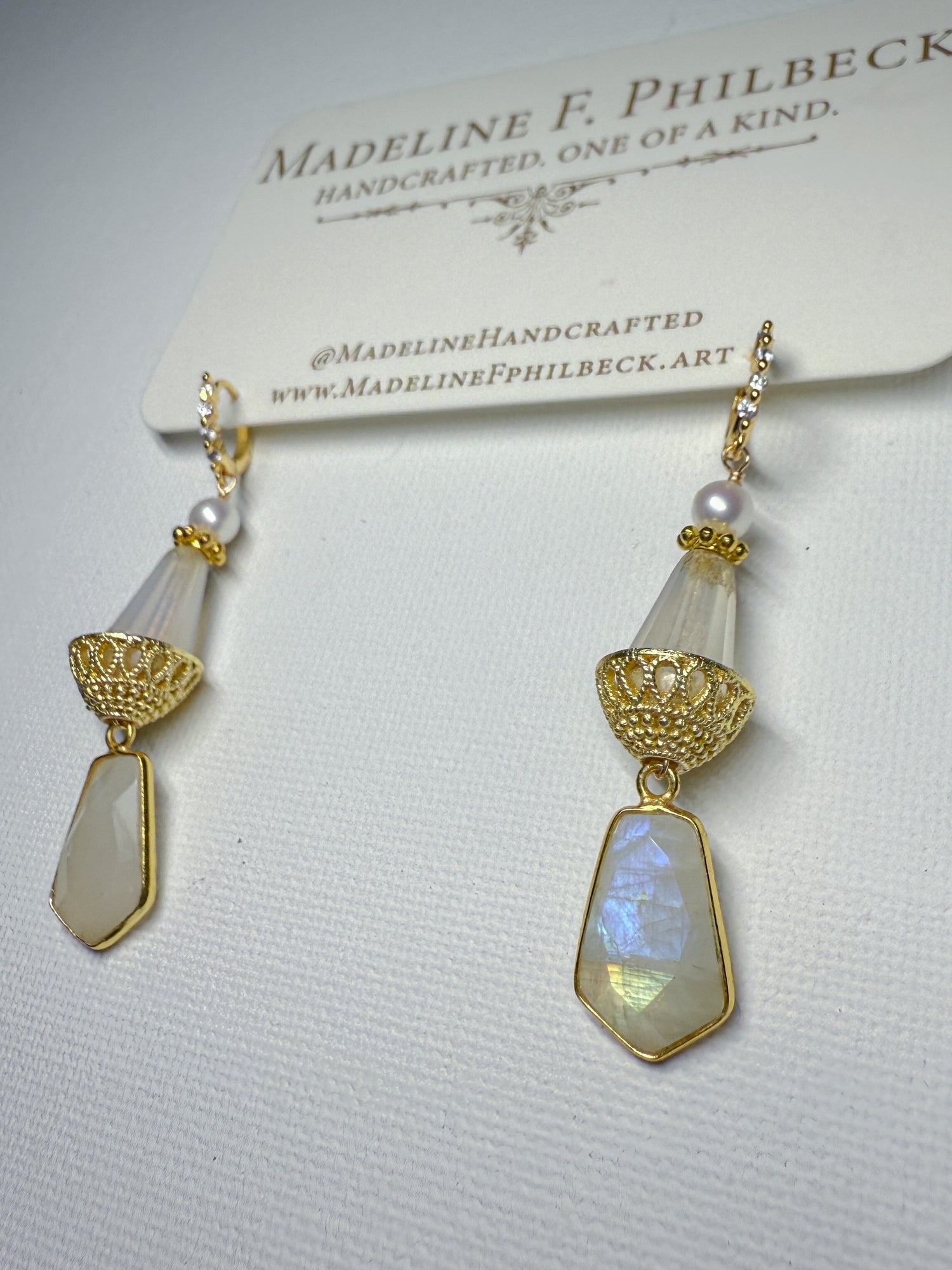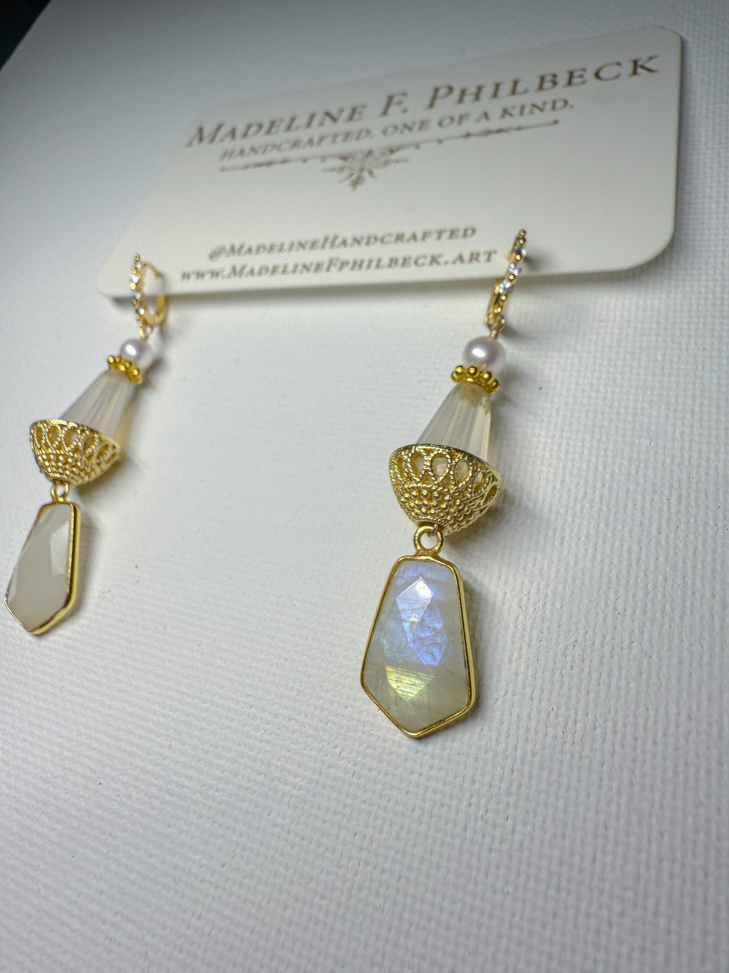 Rainbow moonstone and matte glass with golden basket cap and ivory pearl on brass huggies