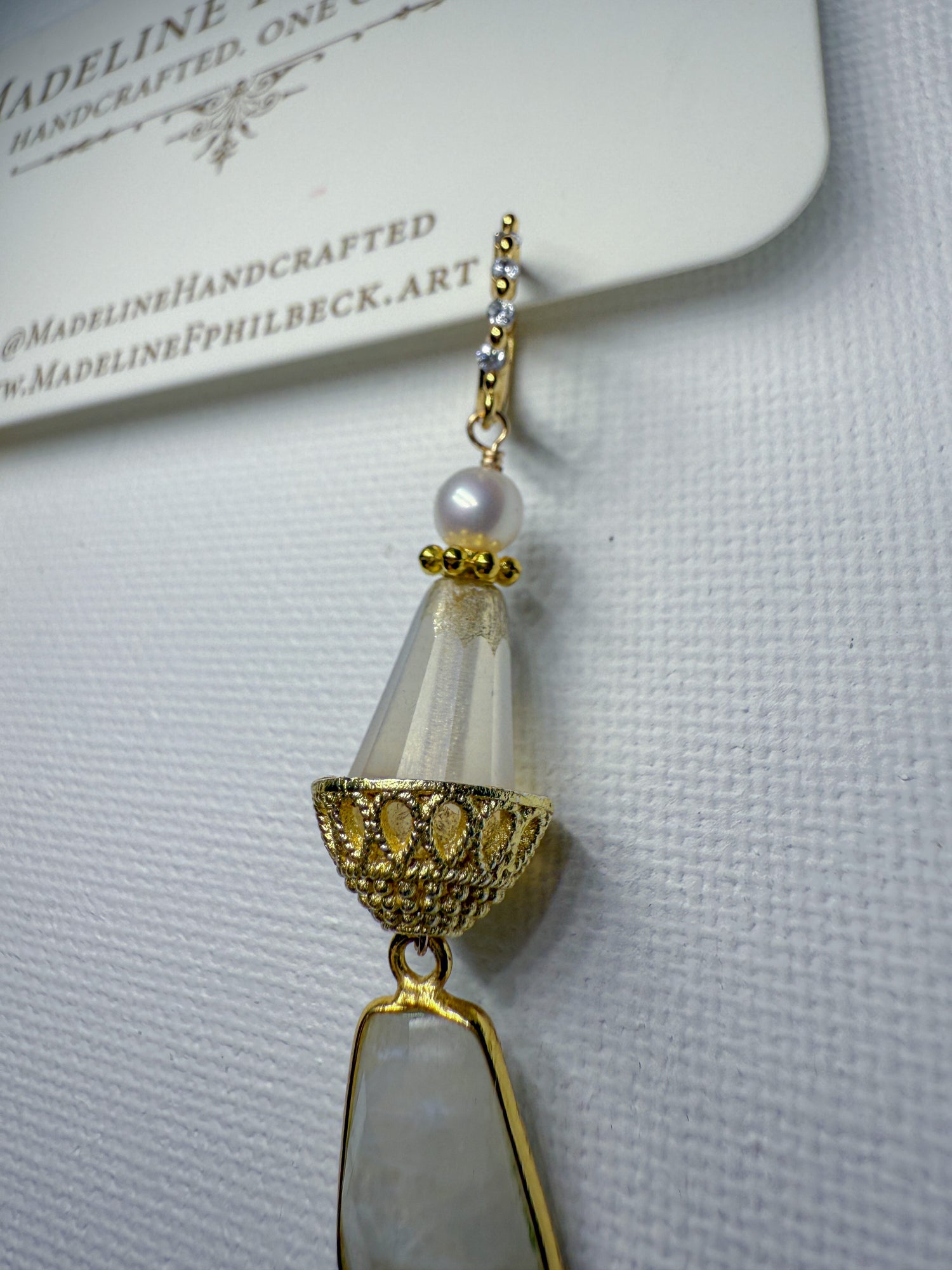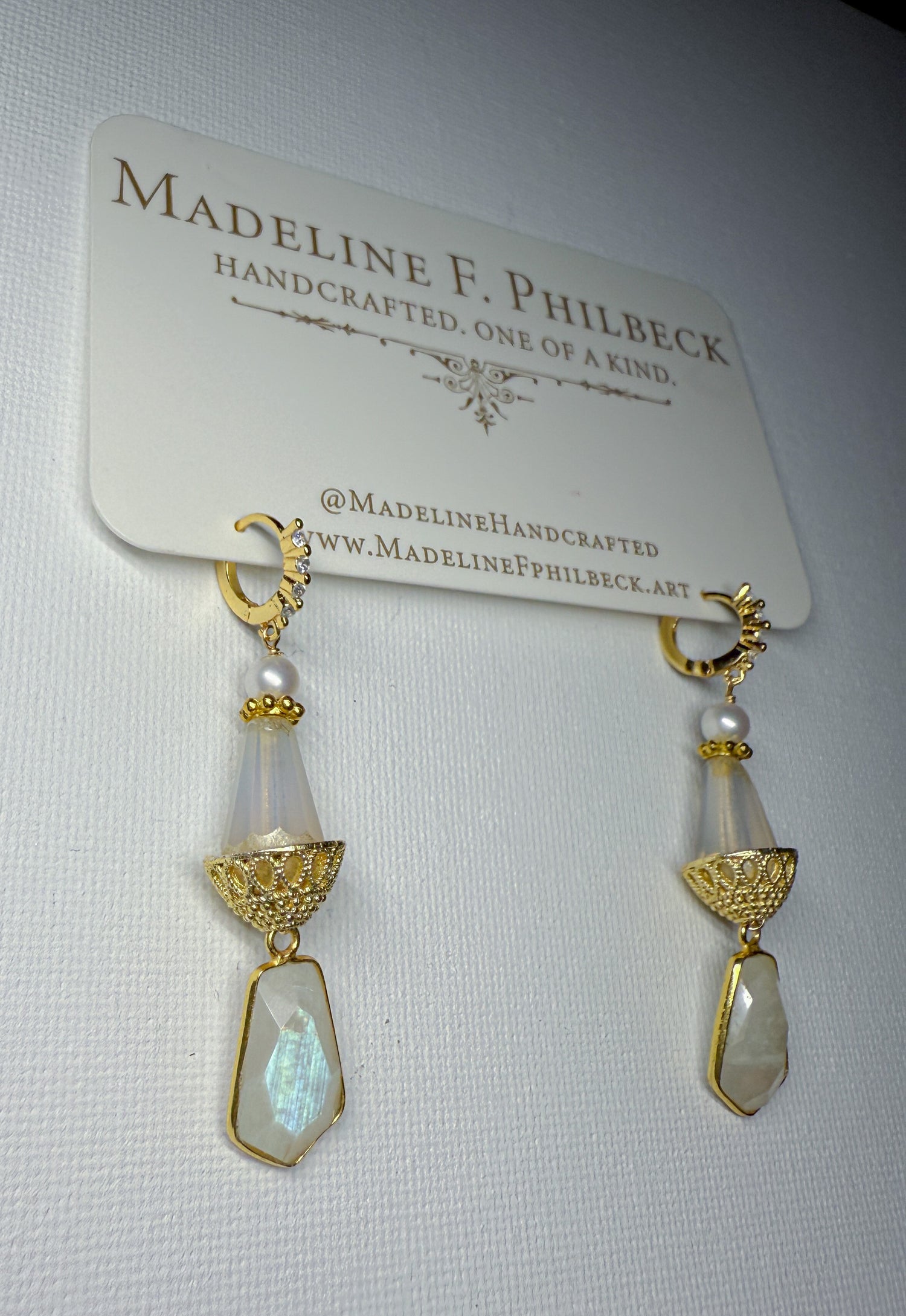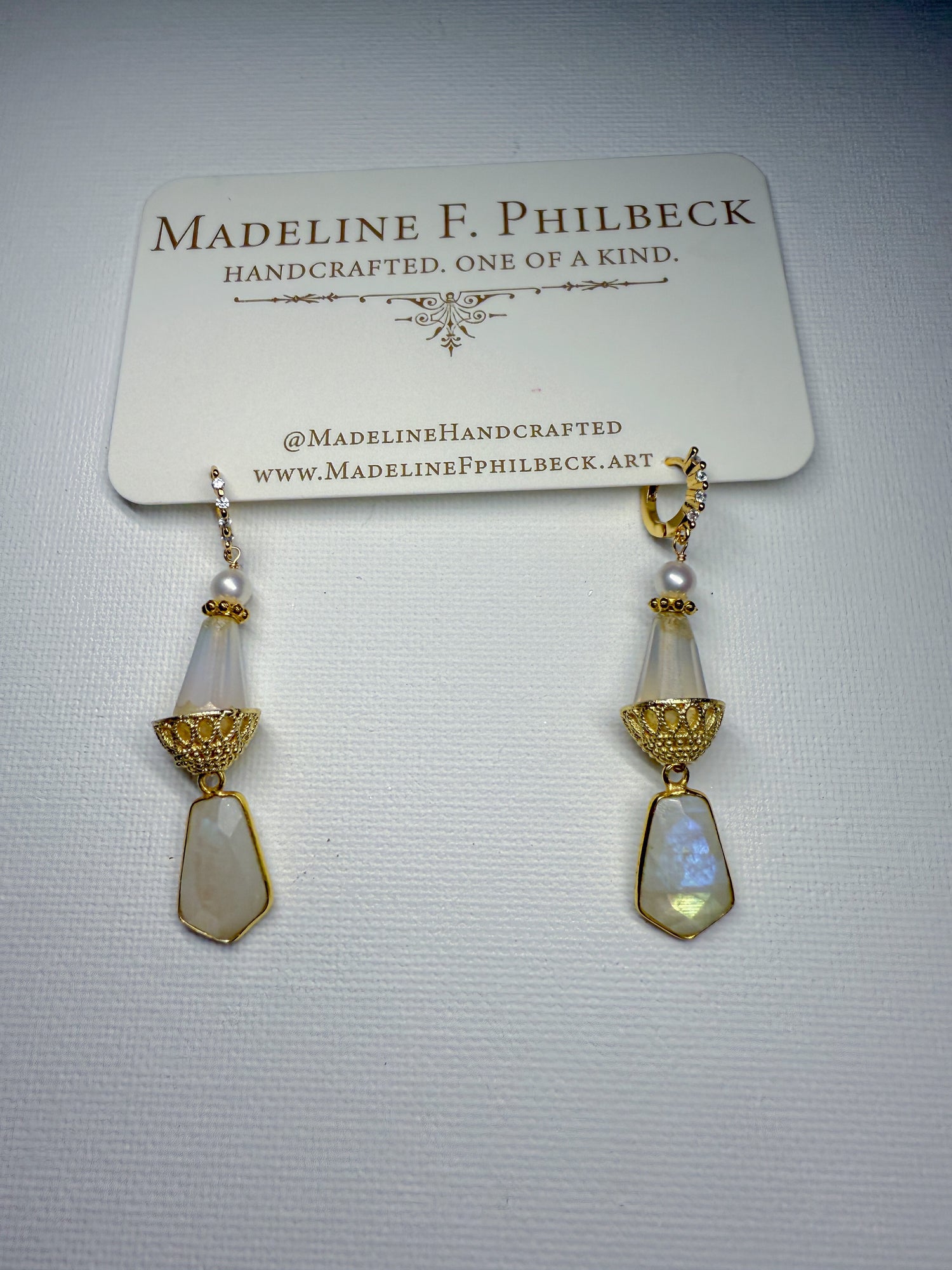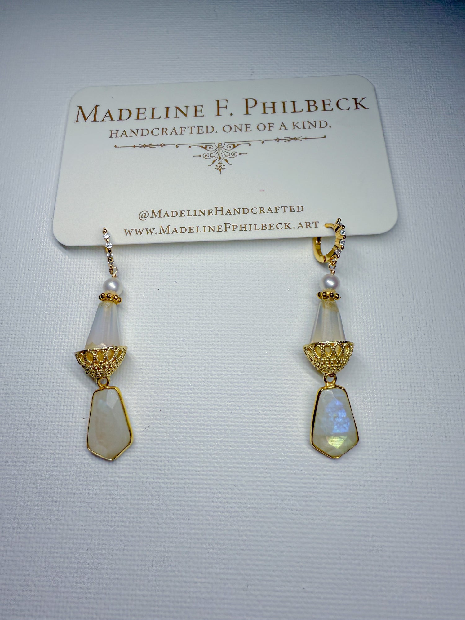 Rainbow moonstone and matte glass with golden basket cap and ivory pearl on brass huggies