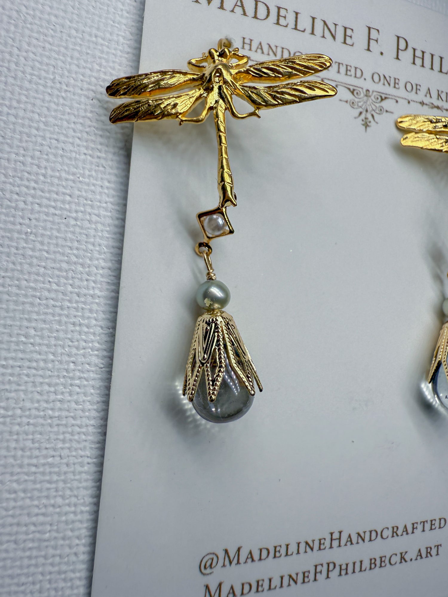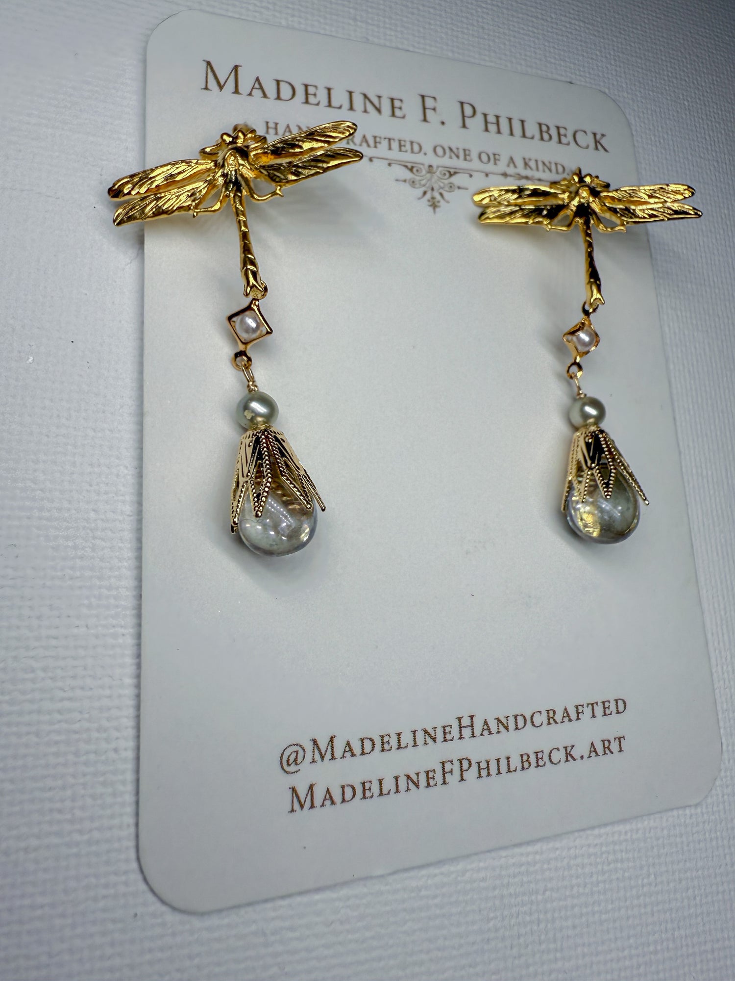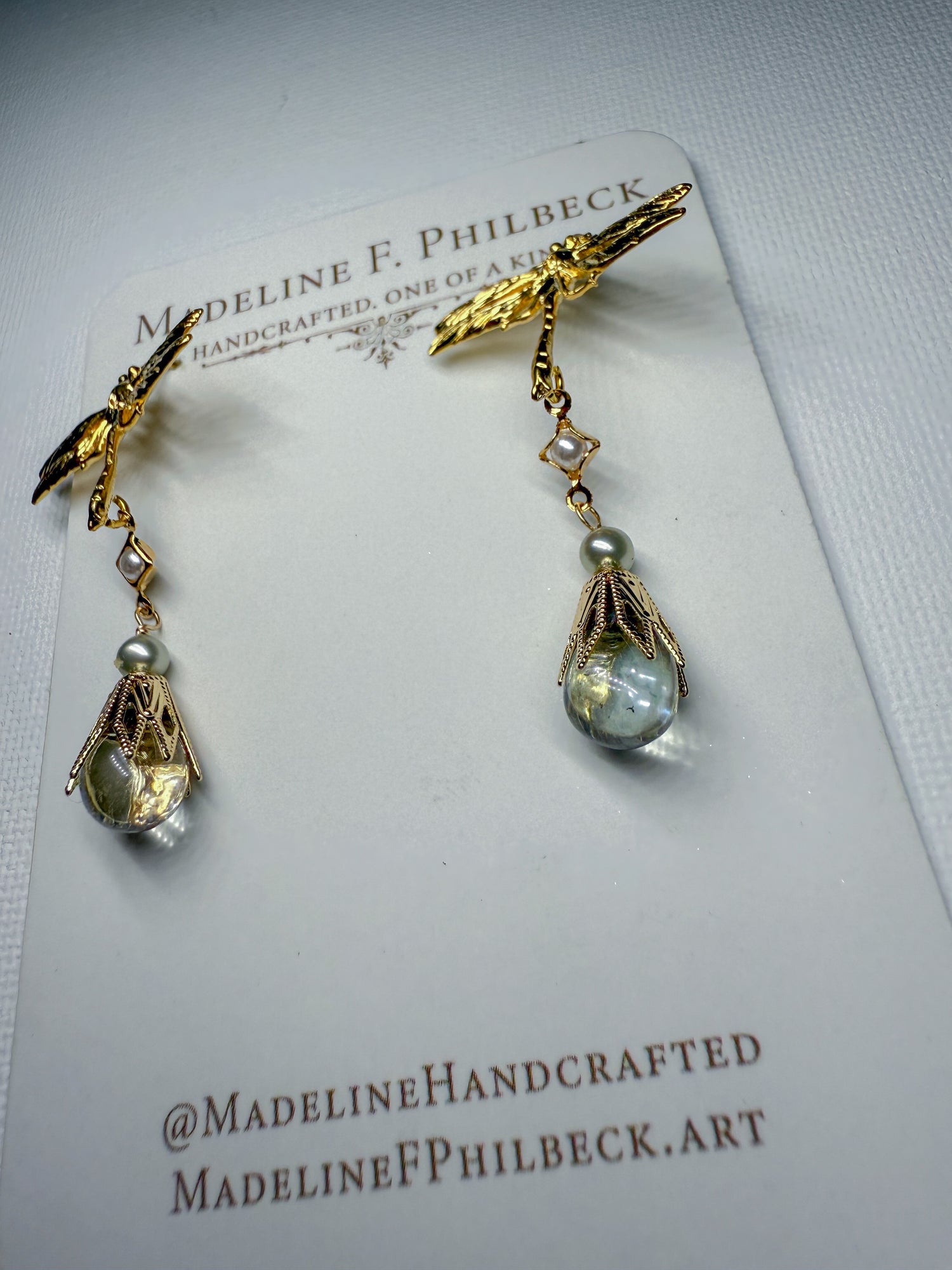 Aquamarine and caged caps with bezeled pearl on brass dragonfly hooks