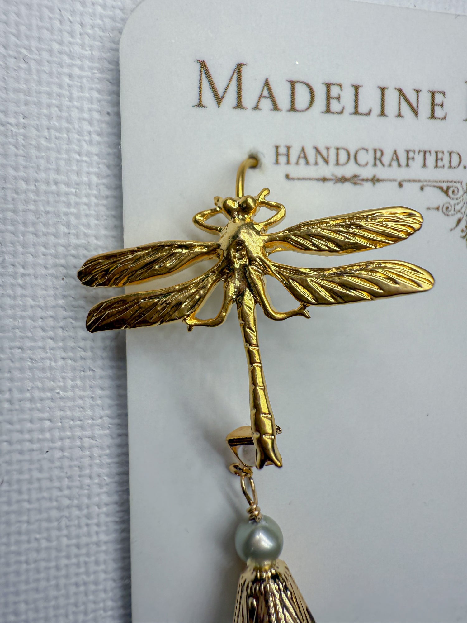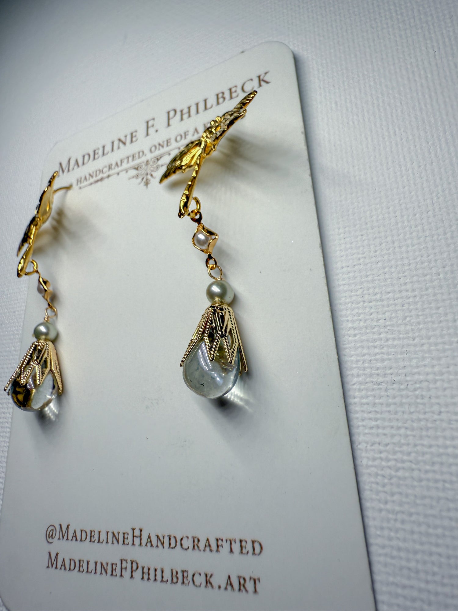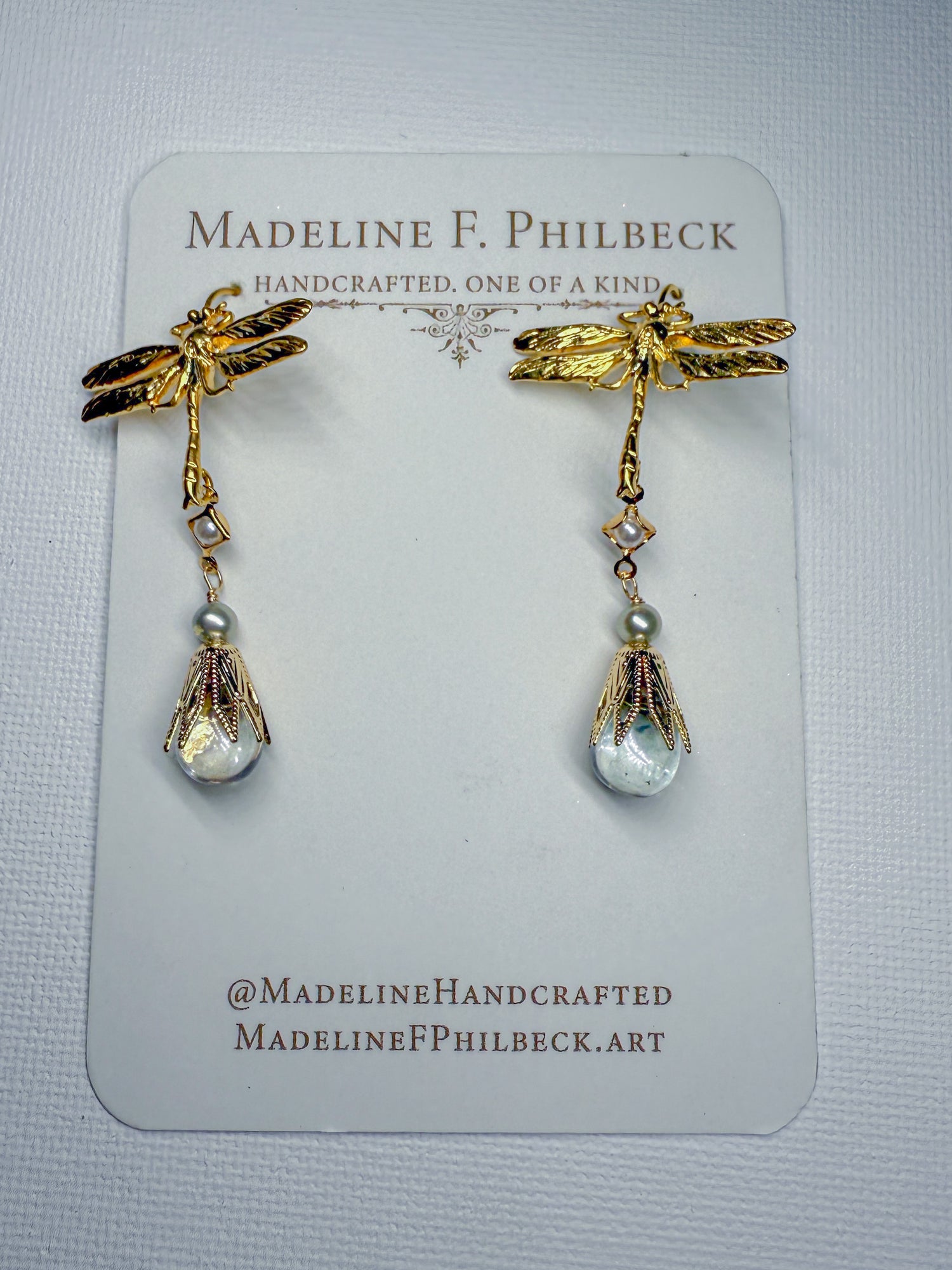 Aquamarine and caged caps with bezeled pearl on brass dragonfly hooks
