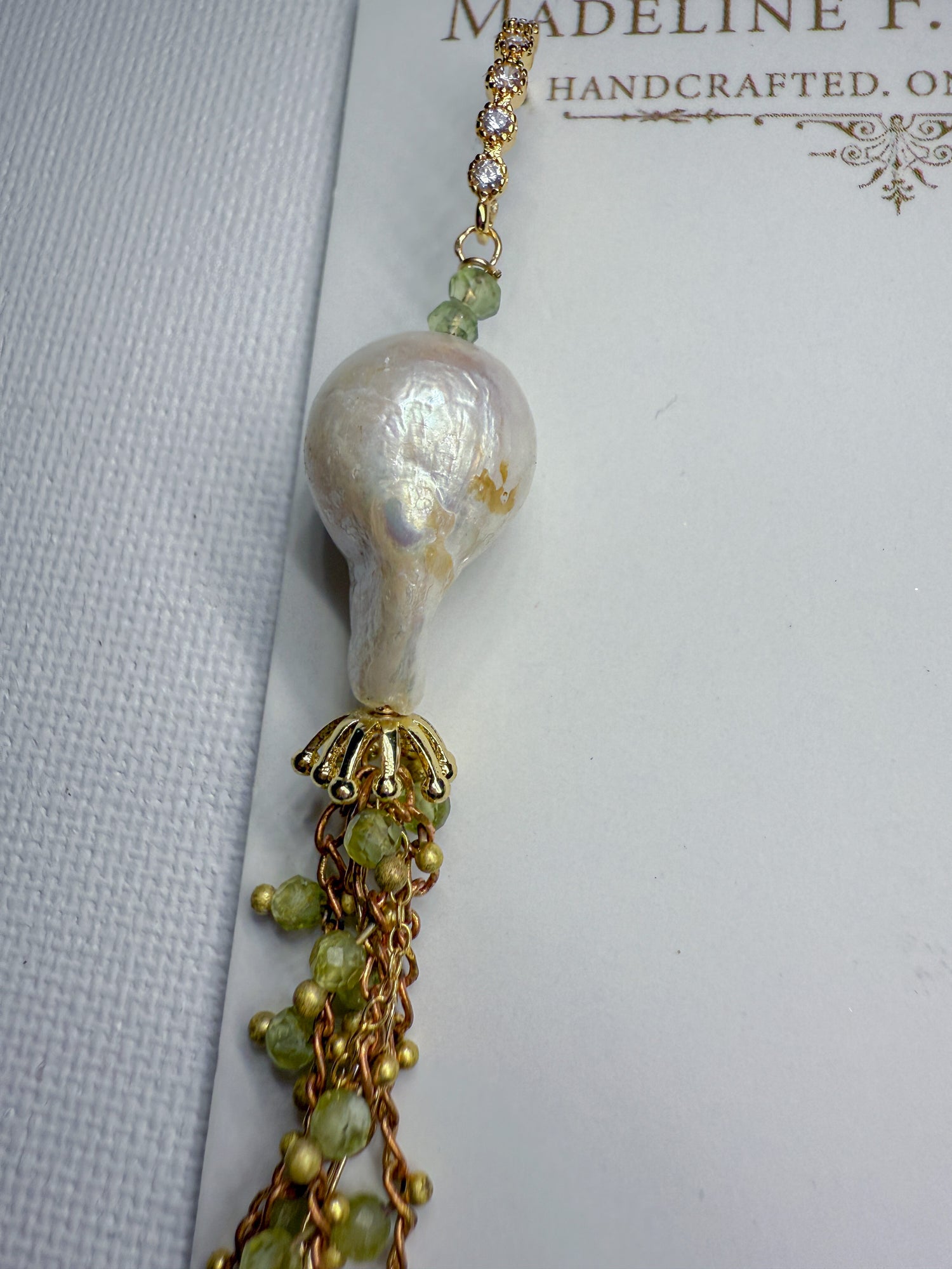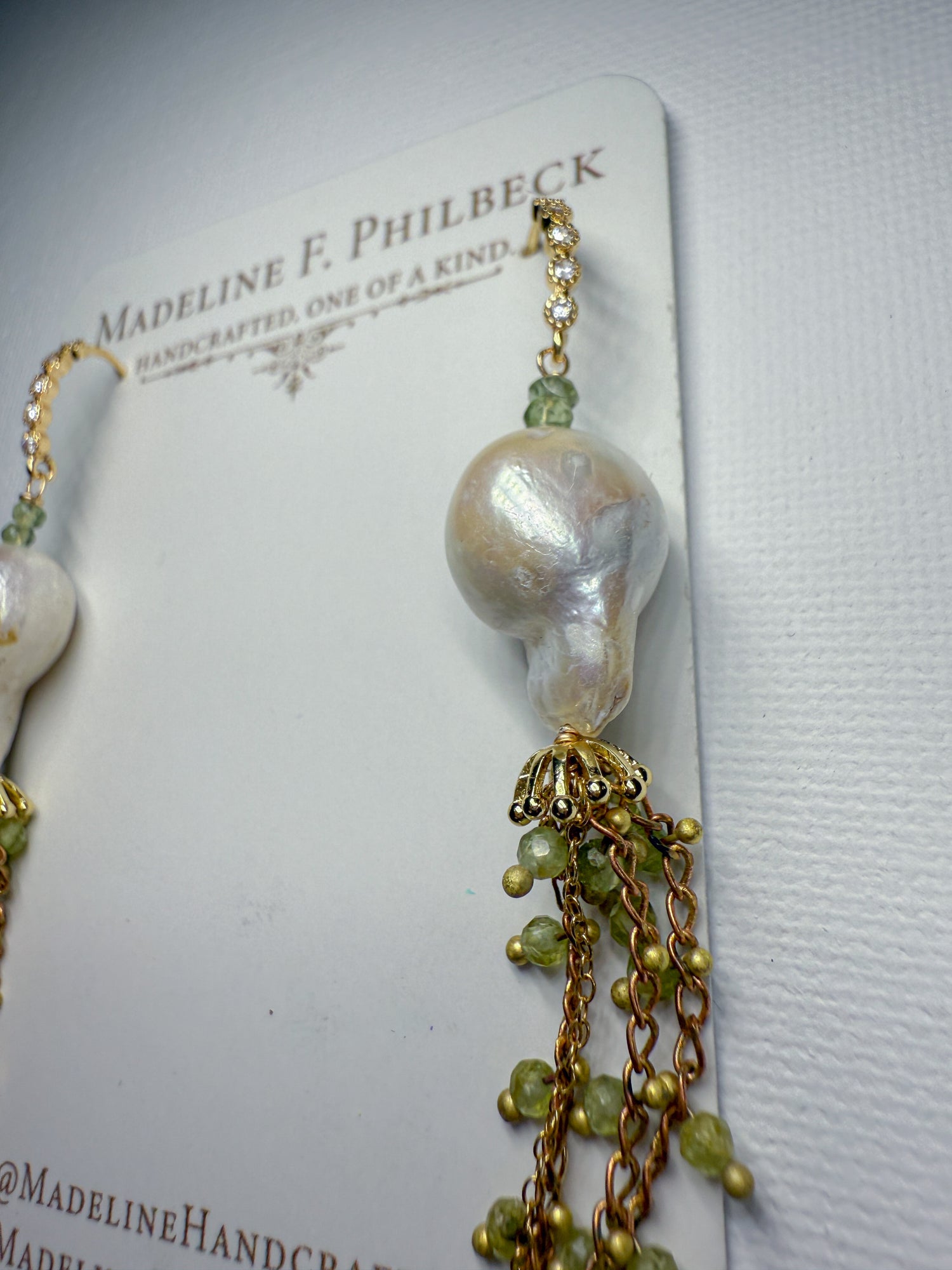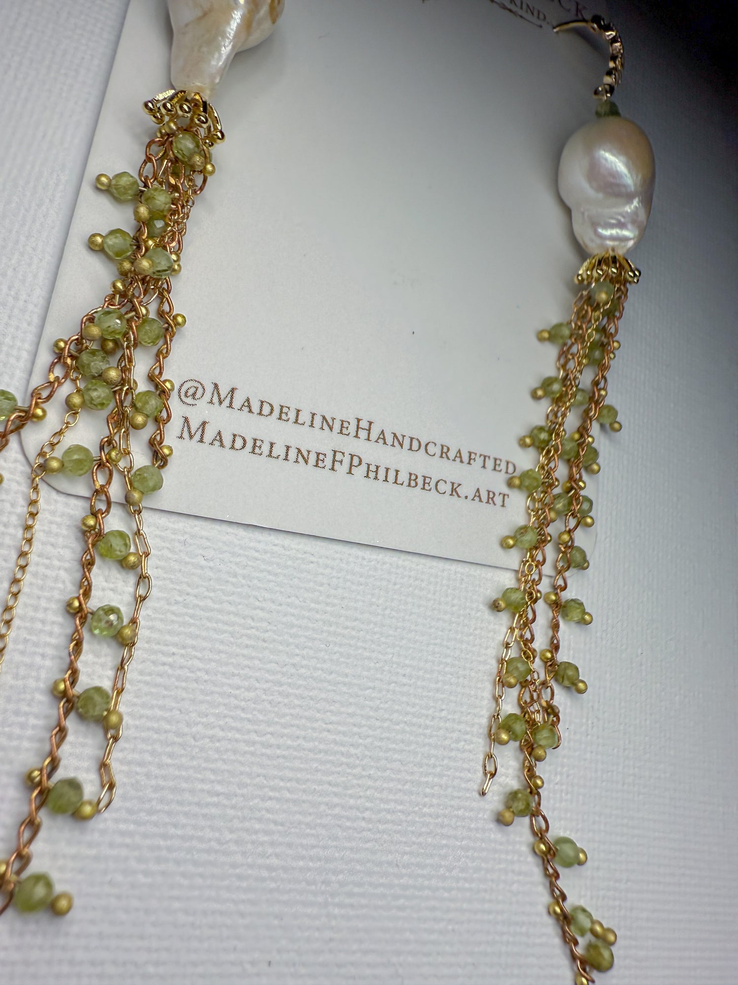 Large baroque pearl with peridot seaweed dangles on brass crystal hooks
