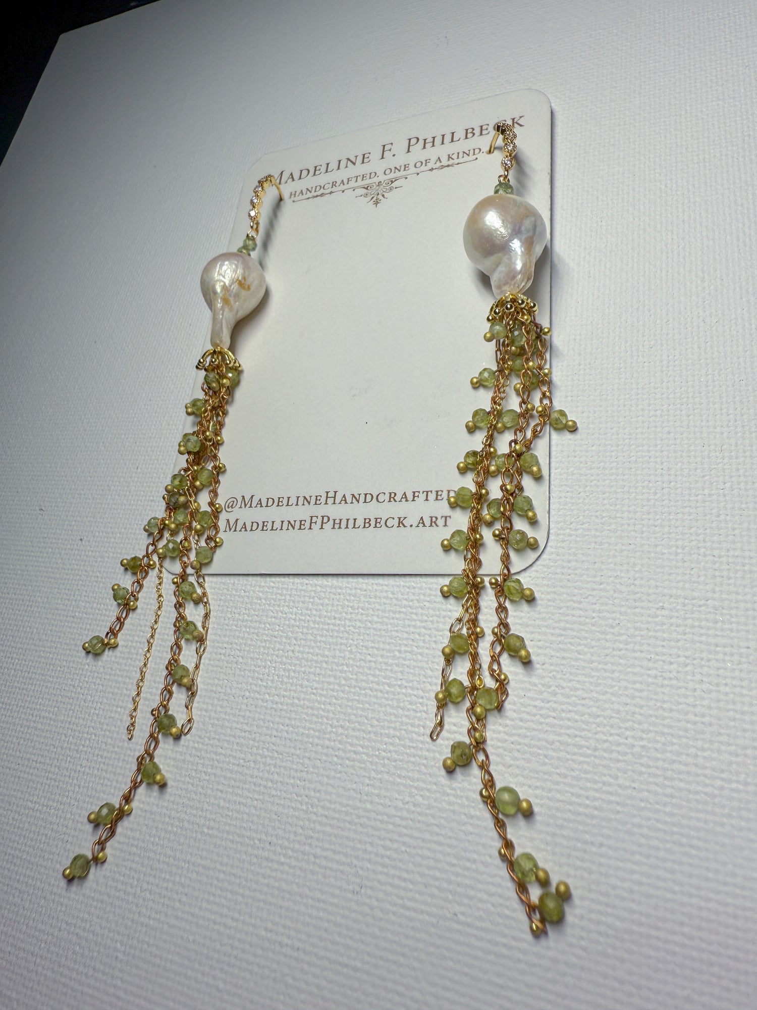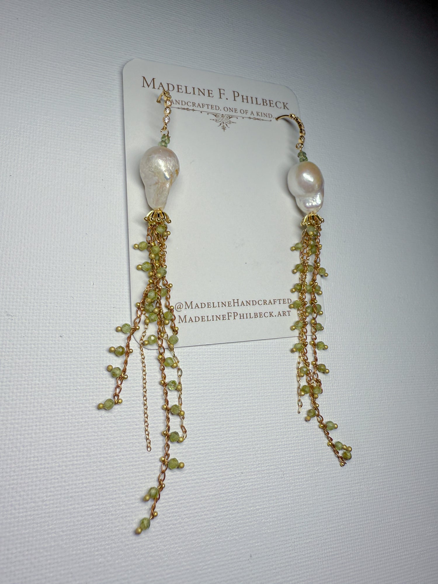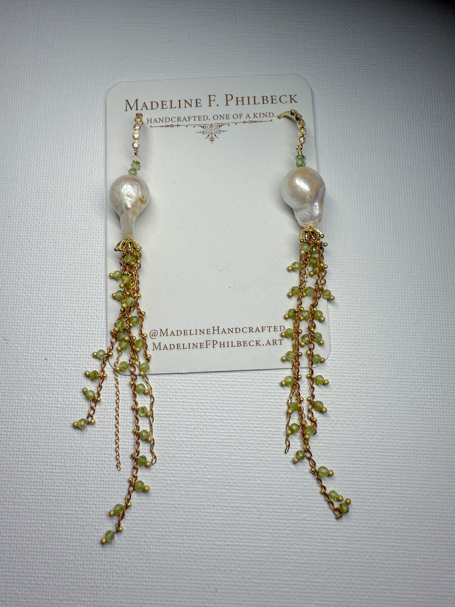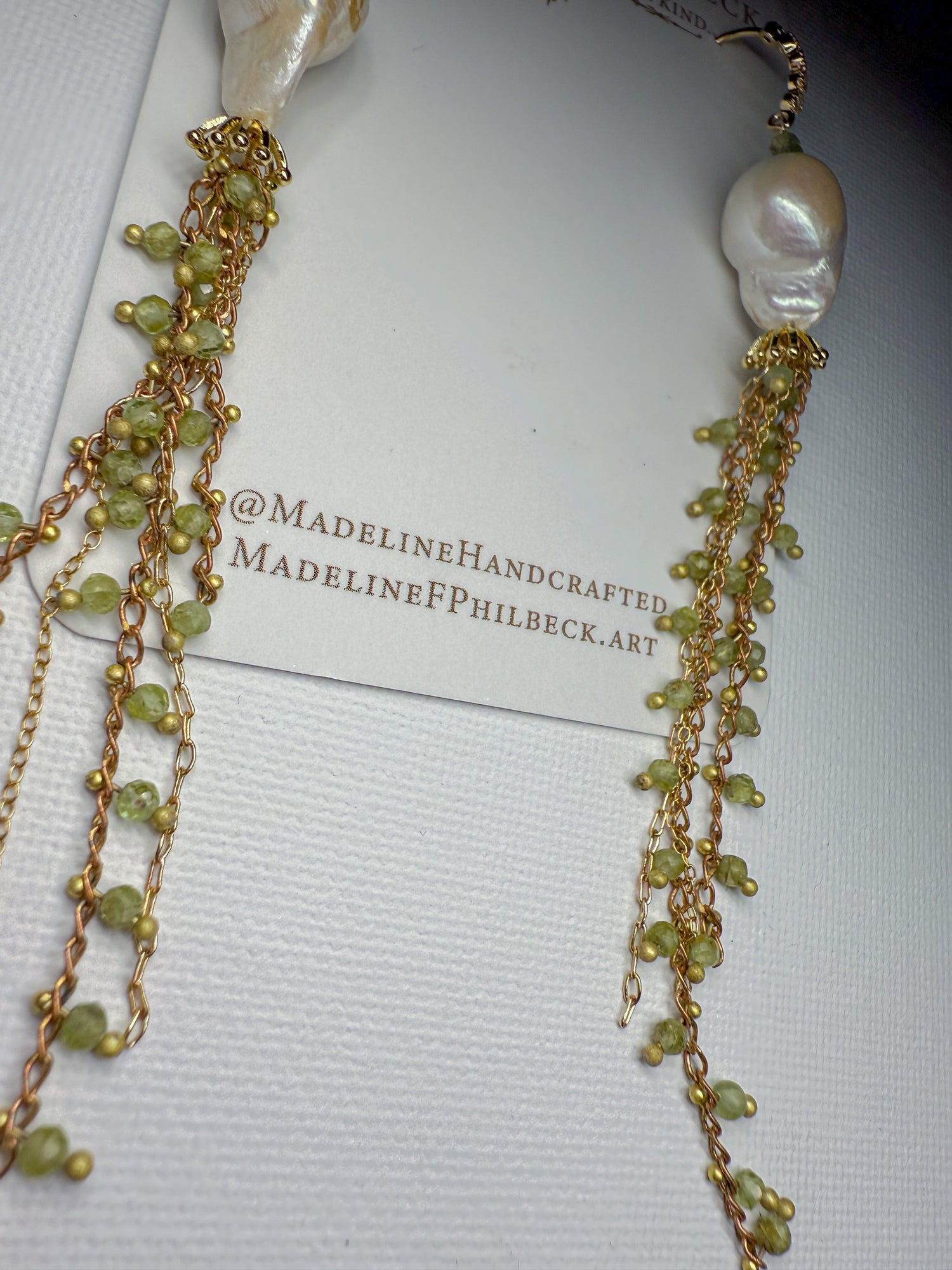 Large baroque pearl with peridot seaweed dangles on brass crystal hooks